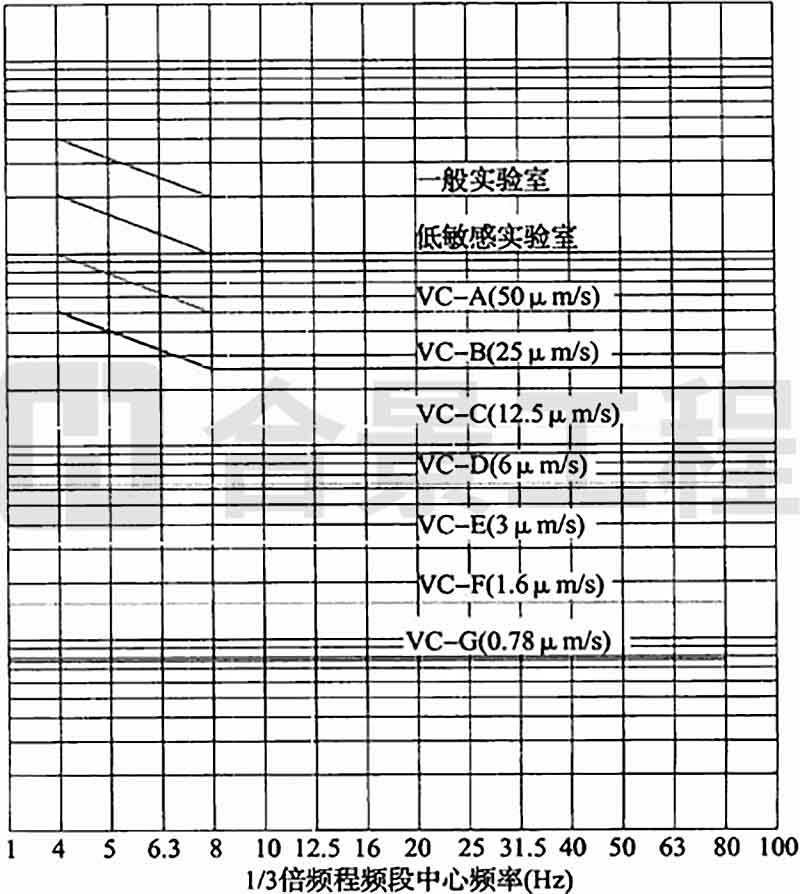 A.0.1 拉絲塔的容許振動參數(shù)可按精密設(shè)備、儀器容許振動通用標準曲線(圖A.0.1)中VC-B(25μm/s)曲線確定。